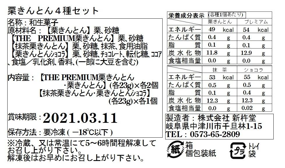 ■規格:プレミアム栗きんとん23g×2個、栗きんとん23g×2個、抹茶栗きんとん23g×1個、ショコラ栗きんとん23g×1個